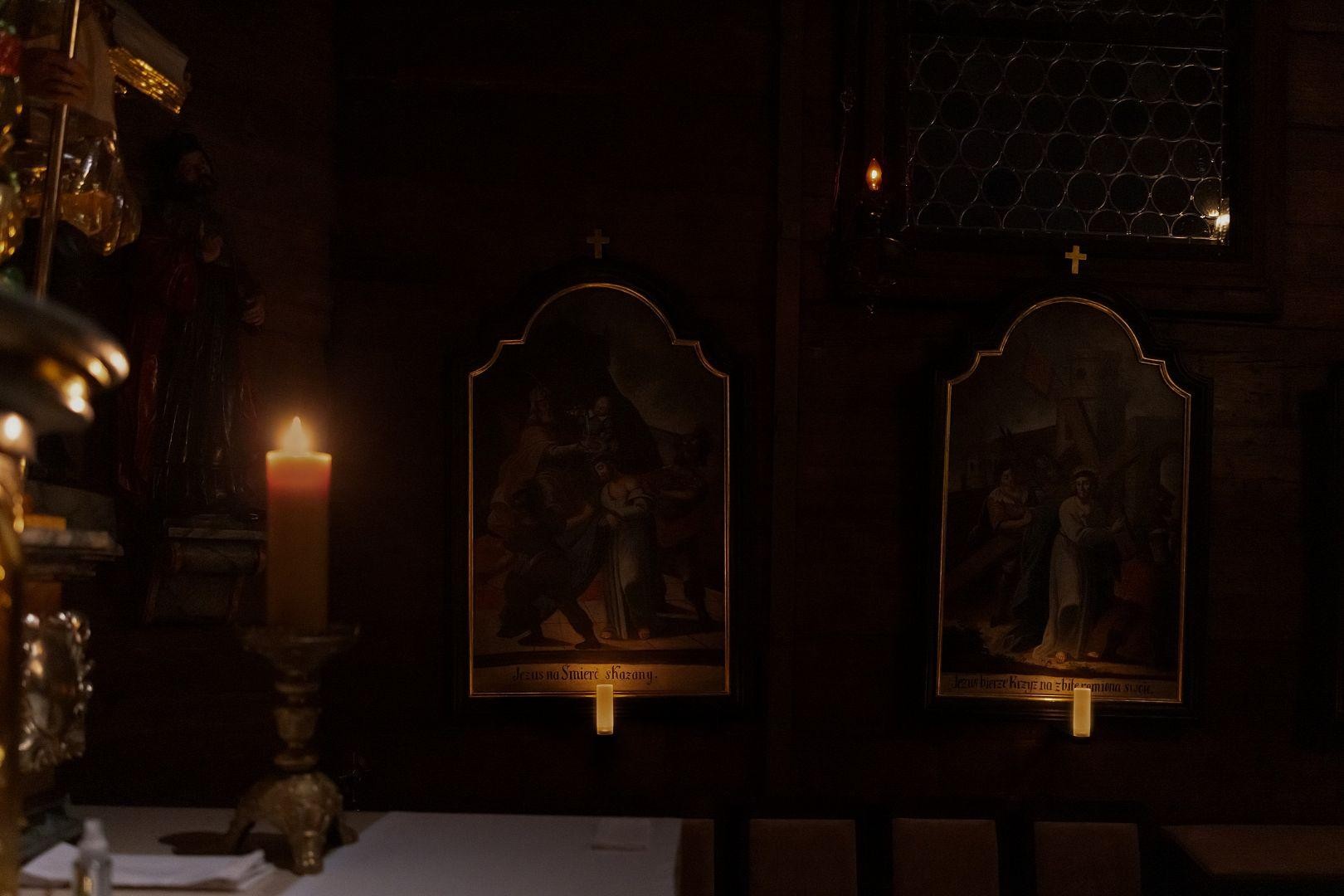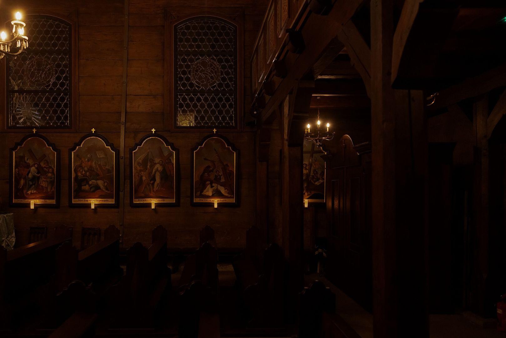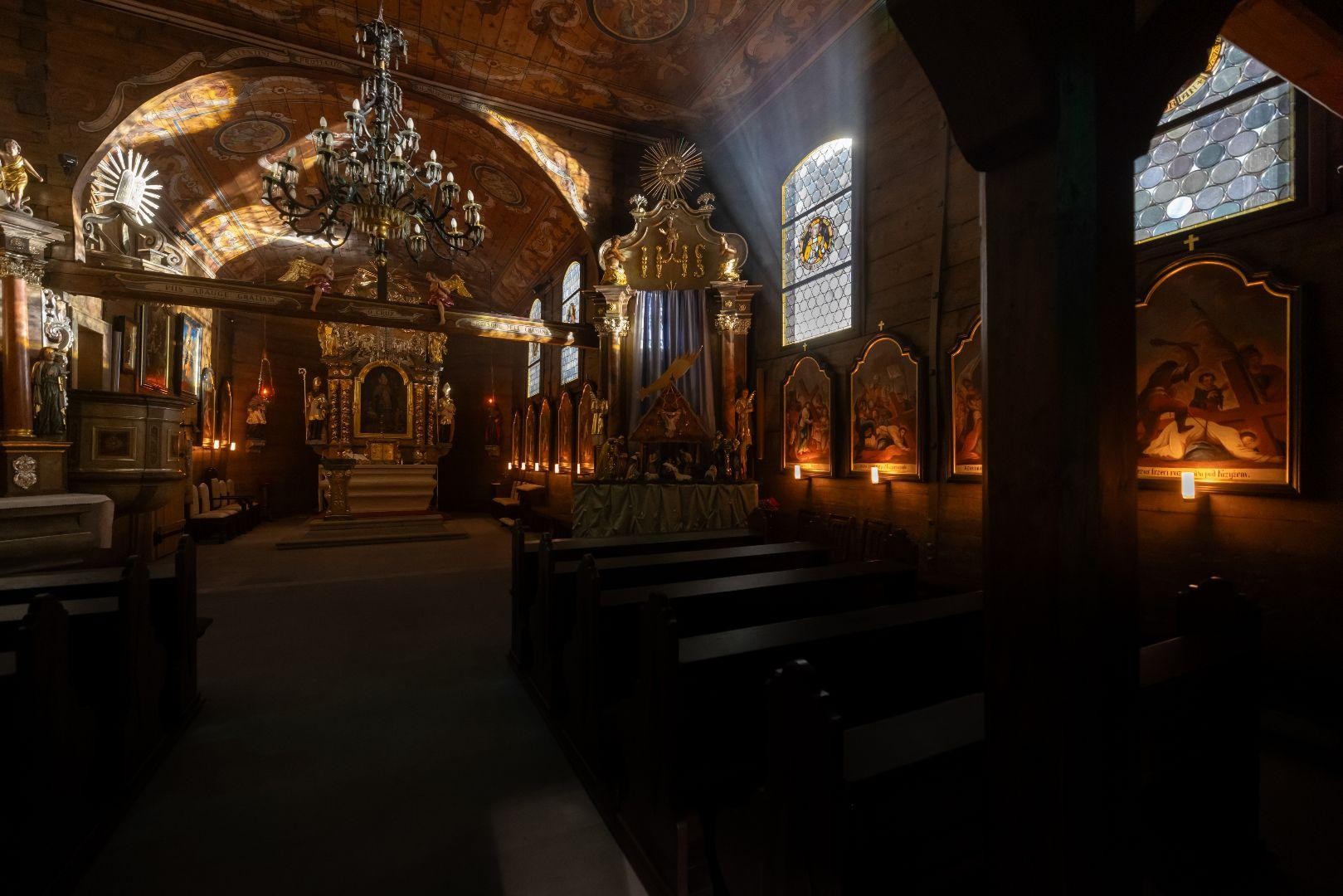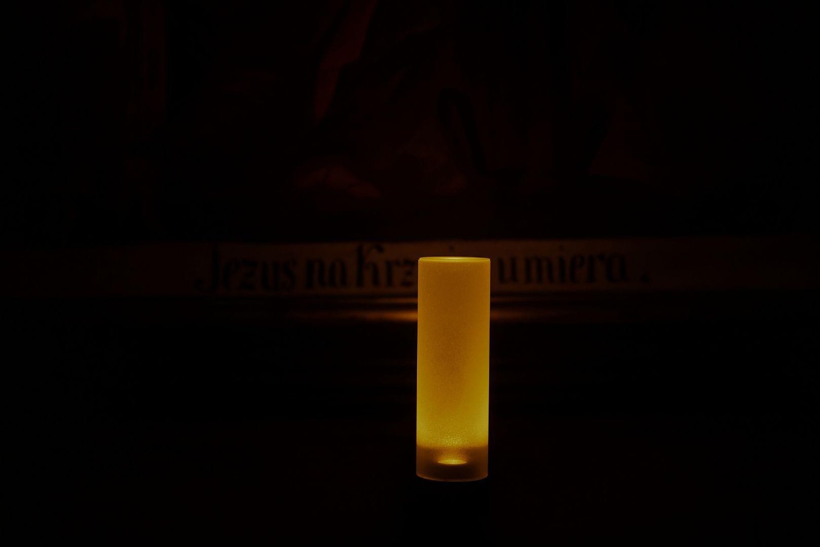 Płomień świecy jest motywem przewodnim we wnętrzu kościoła i powtarza się w w formie indywidualnie zaprojektownych opraw pod stacjami drogi krzyżowej a także w żyrandolach nawy i prezbiterium. Kontrastujące, chłodne światło promieniuje znad ambony, oświetlając malowidła na sufitach i podkreślając niebiański charakter ich tematyki. Jego obecność pozwala wydobyć ciepłe światło świec.