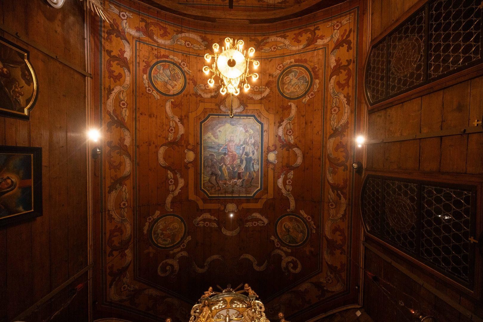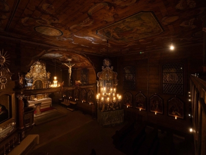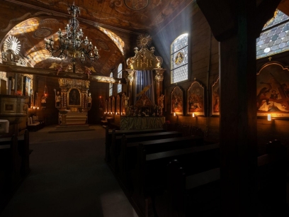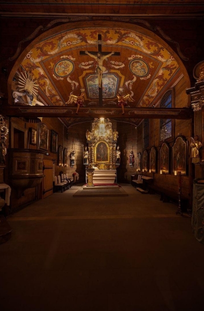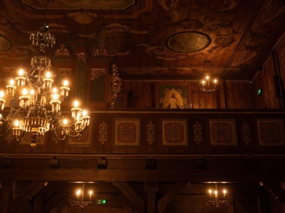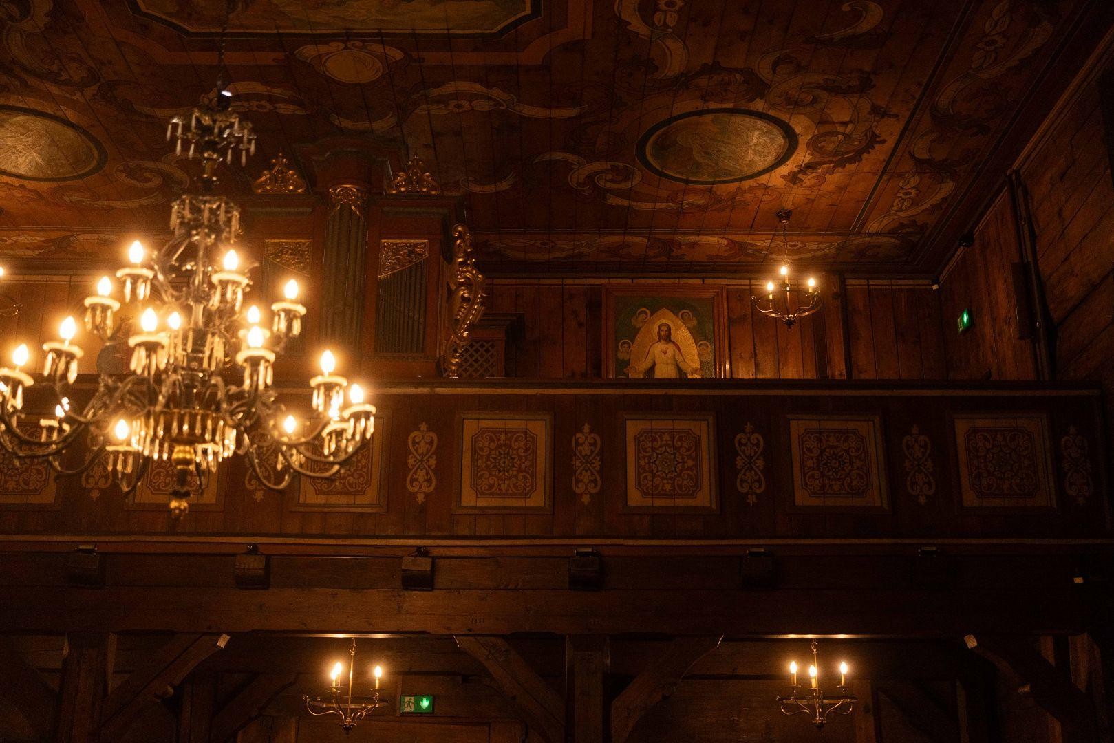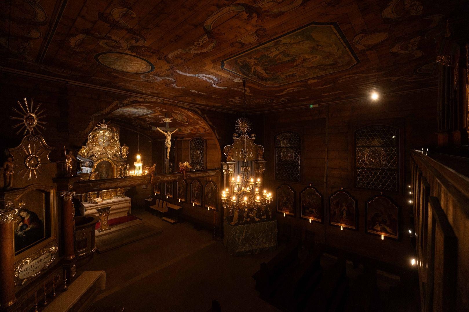 Płomień świecy jest motywem przewodnim we wnętrzu kościoła i powtarza się w w formie indywidualnie zaprojektownych opraw pod stacjami drogi krzyżowej a także w żyrandolach nawy i prezbiterium. Kontrastujące, chłodne światło promieniuje znad ambony, oświetlając malowidła na sufitach i podkreślając niebiański charakter ich tematyki. Jego obecność pozwala wydobyć ciepłe światło świec.